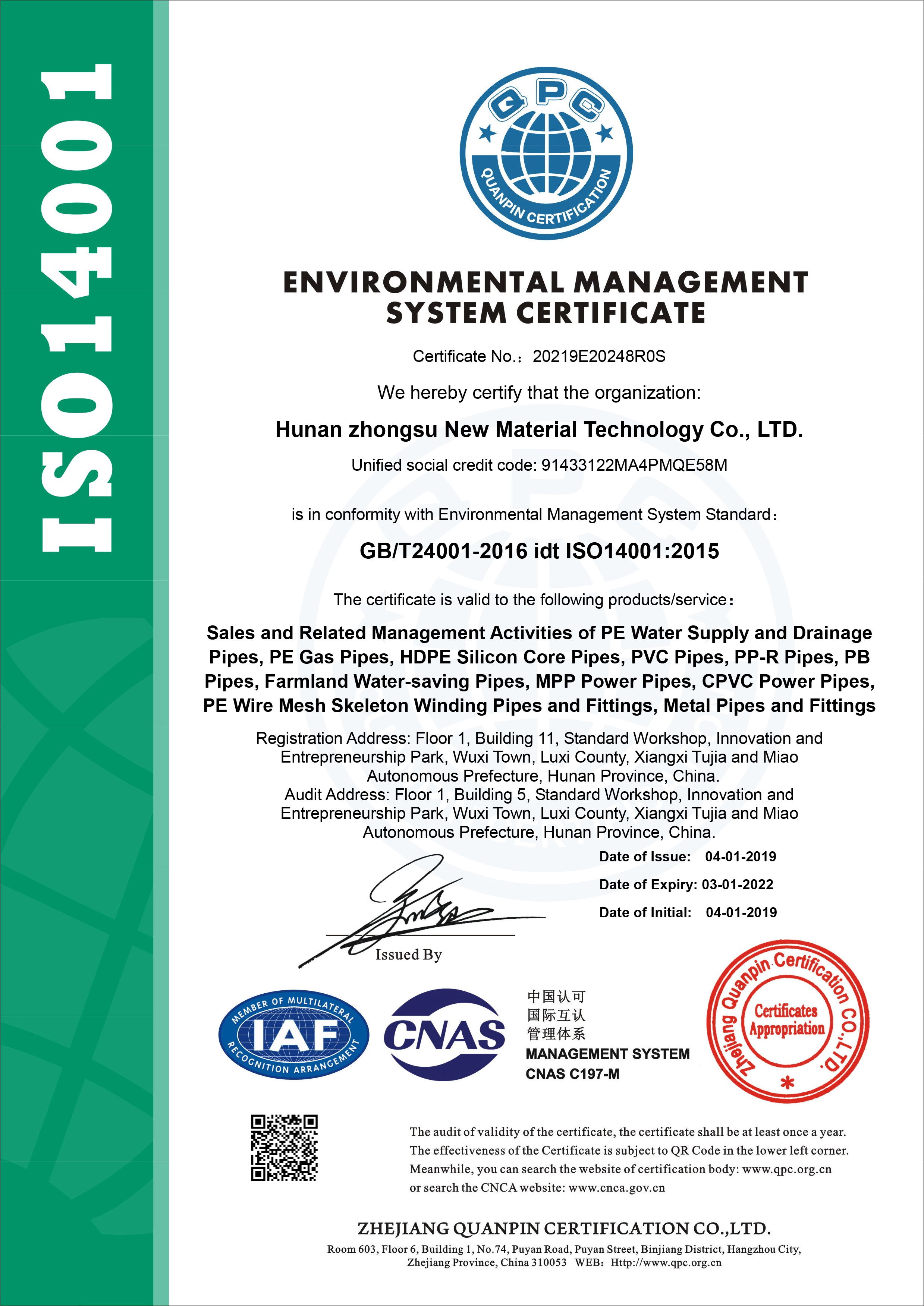 環境管理體係認證證書