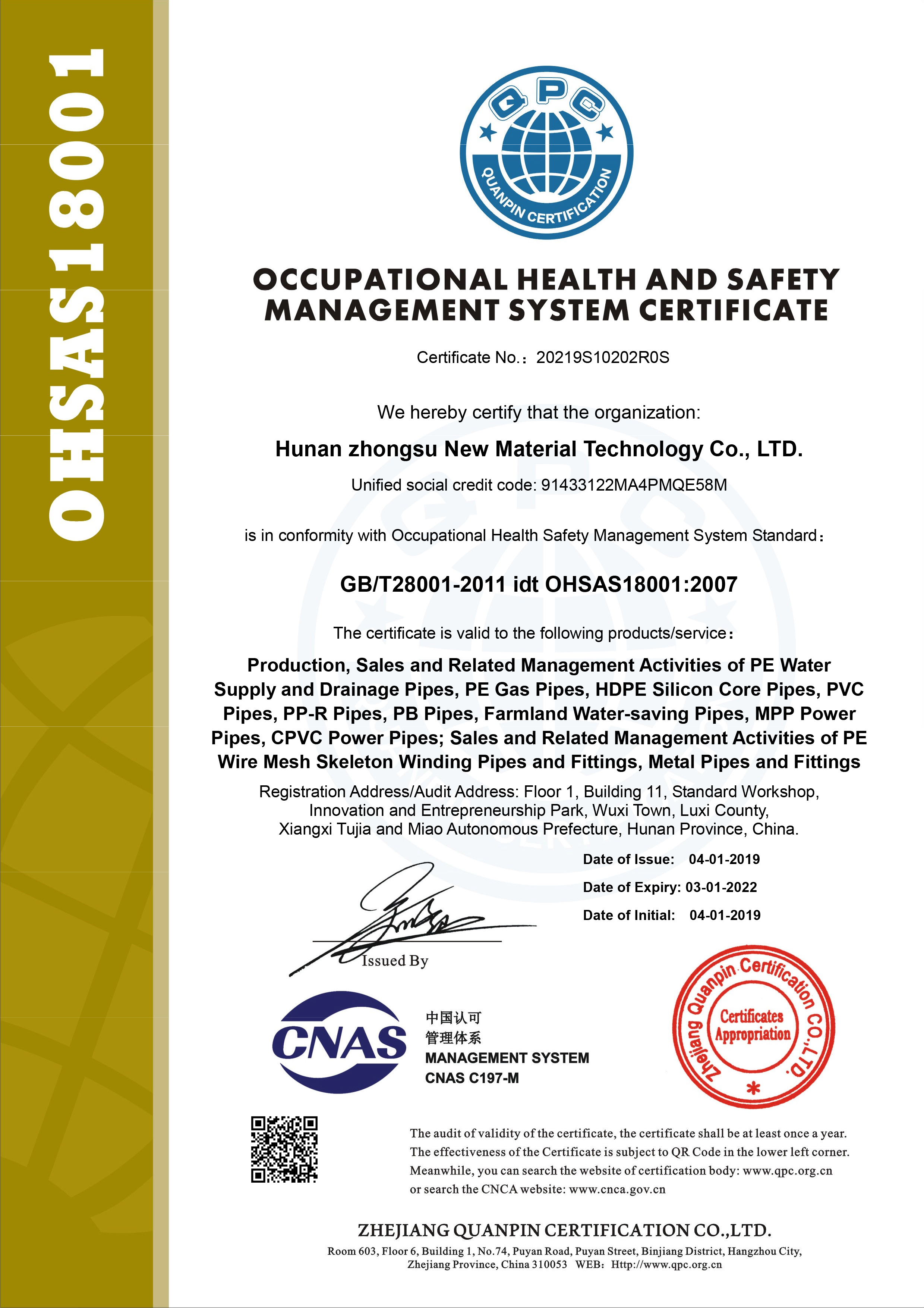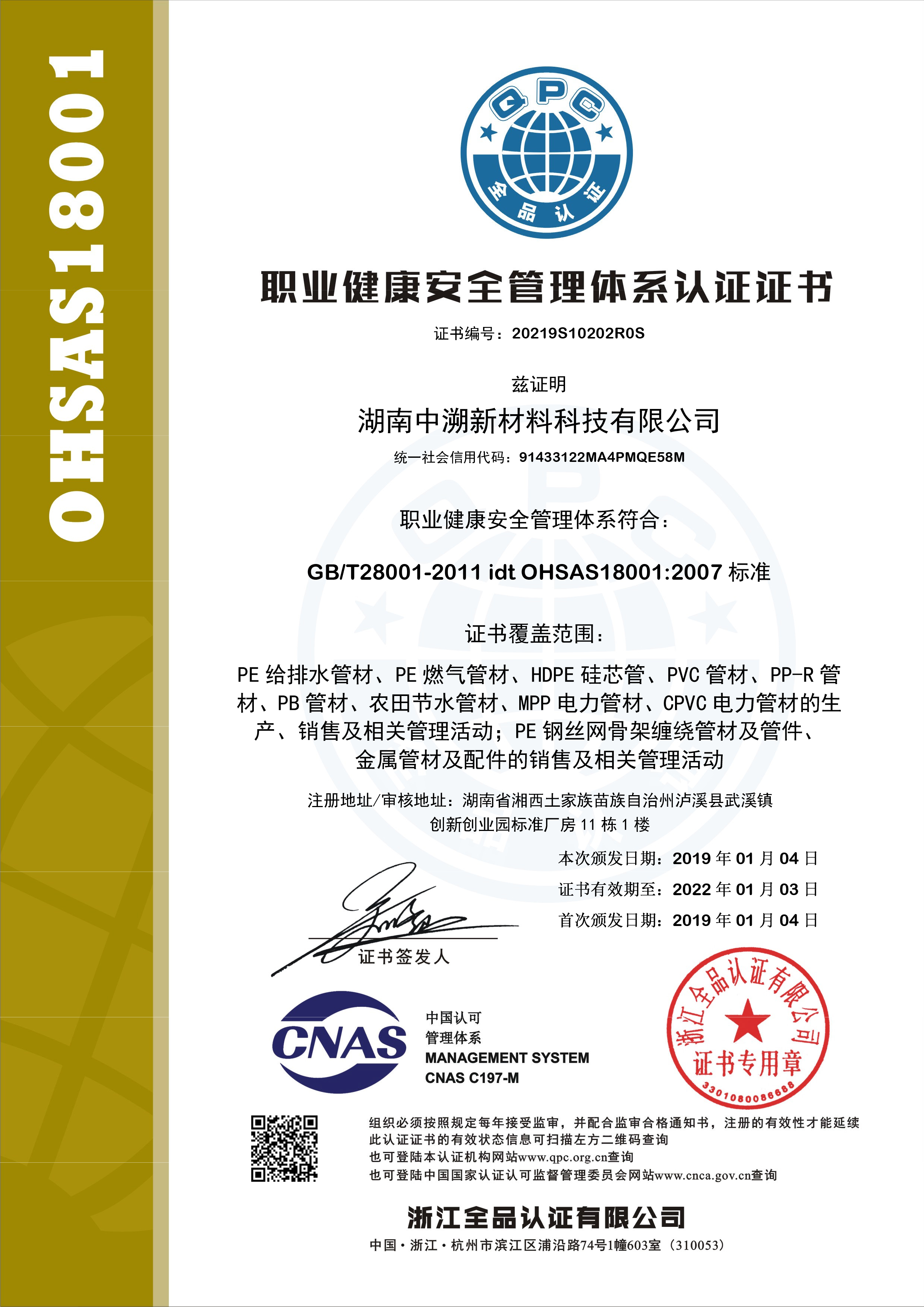 職業健康安全管理體係認證(zhèng)證書